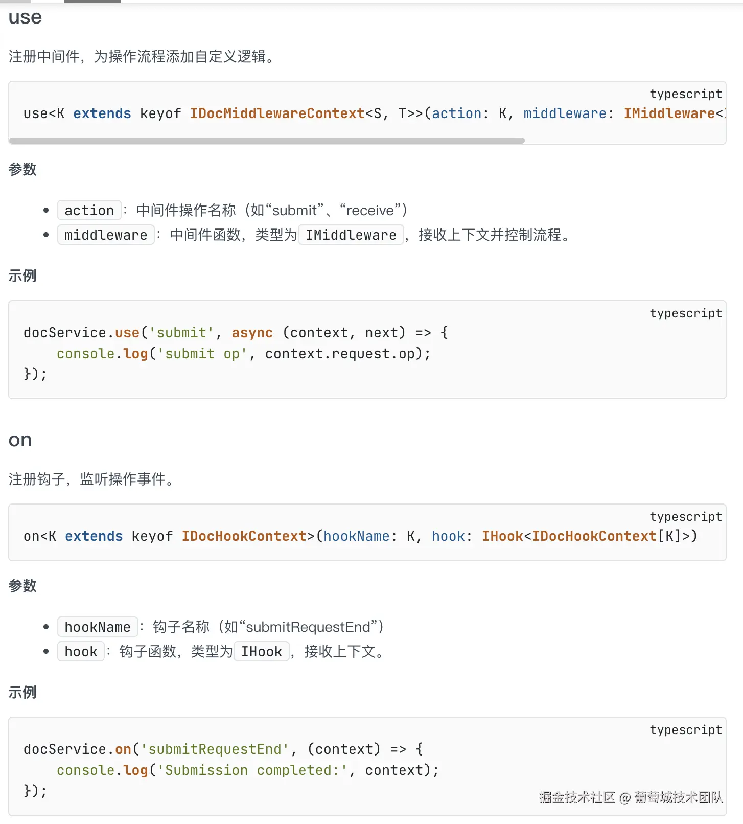 例如SpreadJS协同文档服务不仅支持自定义数据库配置,同时可配置快照存取规则,同时也可以使用use中间件和on注册钩子自定义处理逻辑注册中间件和on注册钩子自定义处理逻辑,在自定义逻辑中记录额外日志或者添加业务相关操作。