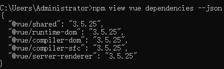 此命令就是上面npm view的另一种用法,它可以查看当前包当指版本的生产依赖和开发依赖,为什么单提出来说了,因为这个是我这一次用的最多的命令,因为安全团队给的需要你做升级的包里,它并不是当前项目的直接依赖,很多都是二级或者三级依赖,如果你要升三级依赖,那你就得去查看祖先级包哪一个版本可以让你这个依赖升级,单提出来的另一个原因是它还有一个在线web工具此处我们还是以vue包为例: