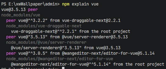 精准解释某个包被安装的原因(谁依赖它、依赖版本范围、安装路径),解决「明明没手动安装,却出现在node_modules」的困惑,个人感觉这个命令和上面ls有一点相似,都可以查看当前包安装了什么版本,哪一个版本被安装是因为哪一个依赖,我们还是以vue包来例