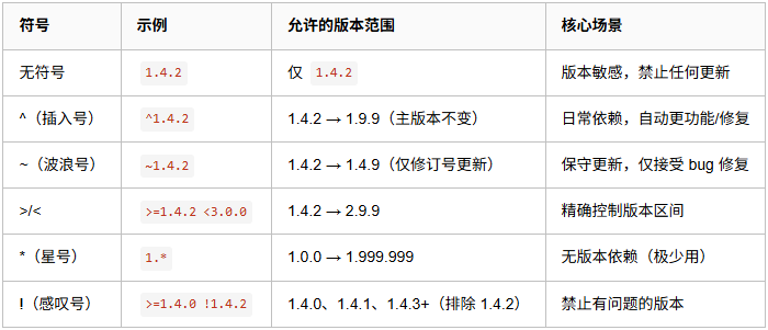 此命令相对其它要介绍的几个命令应该是使用率算高的,它的功能就是指定安装特定的版本先来看一下package.json版本规则符号对比表: