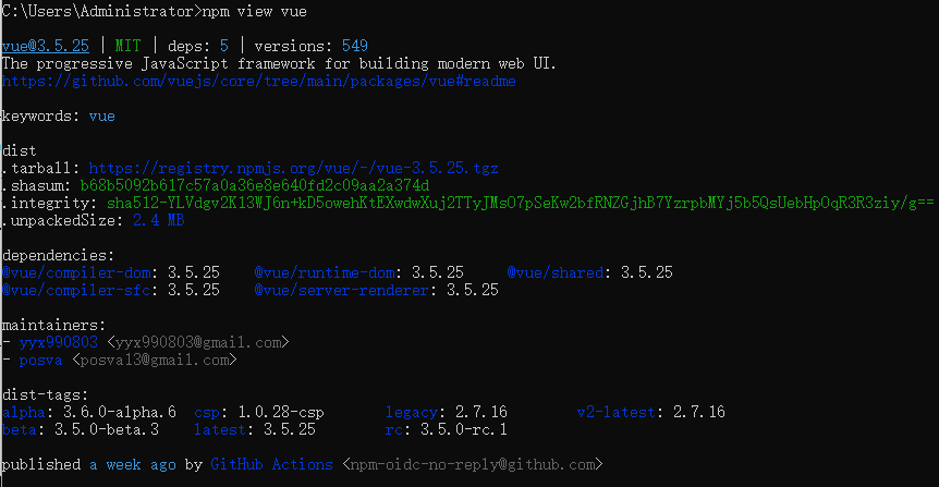 此命令还可以指定版本号,使用方式是npm view vue@version,就是查看指定版本的公开信息,这个命令给我的感觉就是在命令行中打开vue包的npm简版详情页