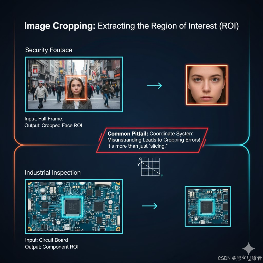 图像裁剪的核心需求是"提取感兴趣区域(ROI)",比如从监控画面中截取人脸区域、从工业质检图中截取待检测部件。很多人觉得裁剪只是"切片操作",但实际工程中常因对坐标体系的误解导致裁剪失败。