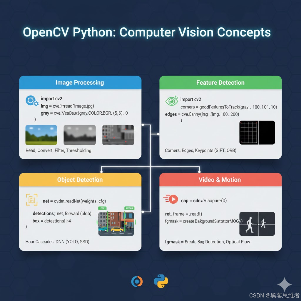 在计算机视觉领域,OpenCV + Python 是工程师入门与落地的首选组合------Python 的灵活高效降低了开发门槛,OpenCV 丰富的算法库则覆盖了从基础处理到智能分析的全链路需求。