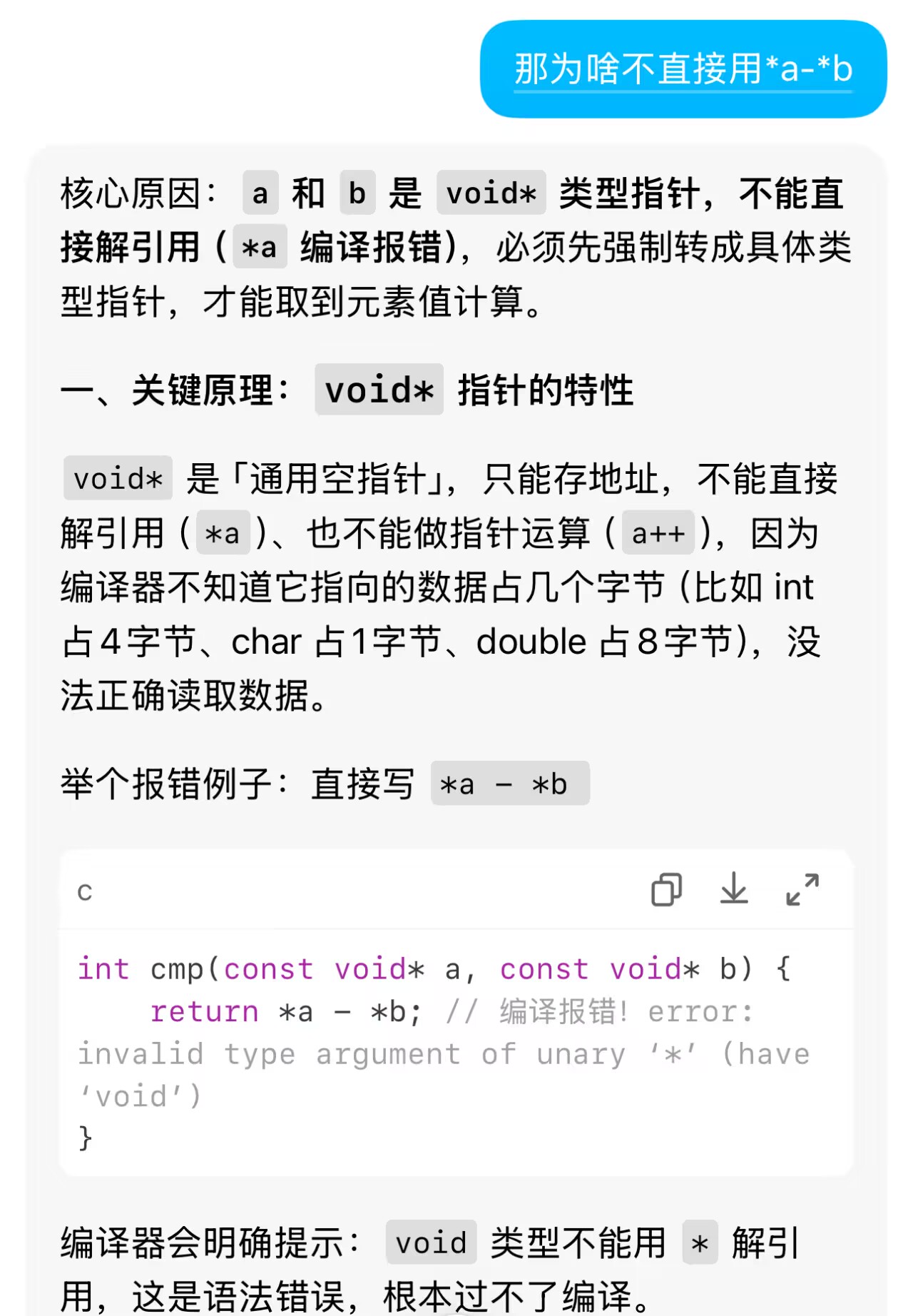 • 入参 a、b:指向两个待比较元素的指针(必须先强制转换为对应数据类型指针,再解引用);