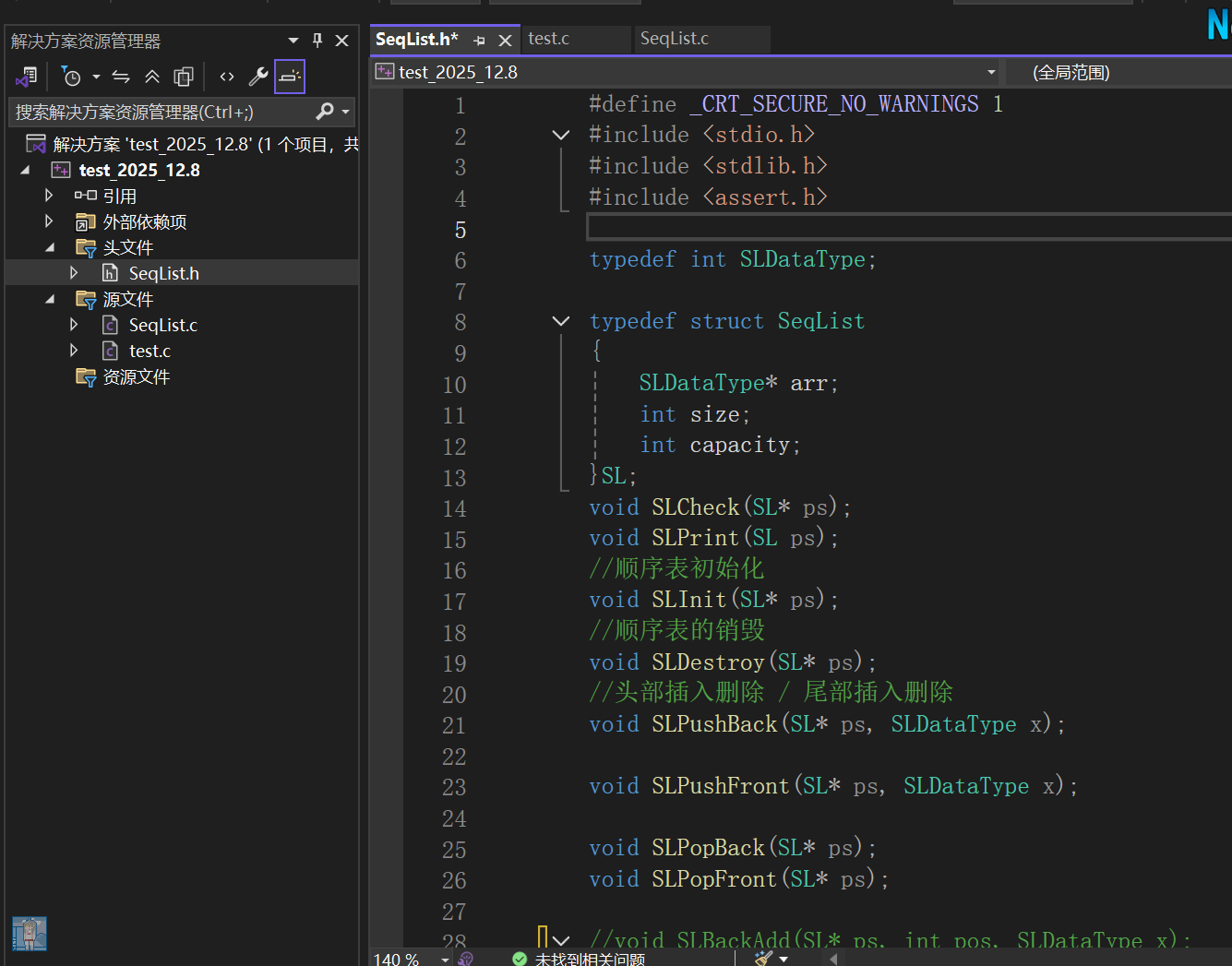 首先,由于我们这是一个项目,所以我们应该有属于这个项目的文件,我们这里是关于顺序表的,所以头文件就可以命名为SeqList.h,再然后把函数的声明都放在这个头文件当中,把函数的代码实现放在SeqList.c文件中,再然后我们在test.c文件中去测试就可以了。