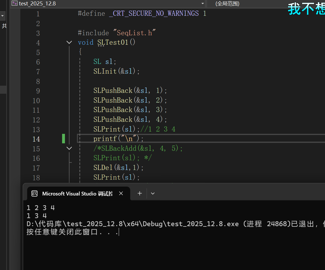 我们只需要在test.c文件中去测试我们代码的逻辑有没有问题即可,我们来举个例子,测试下尾插和指定位置删除: