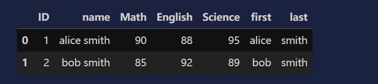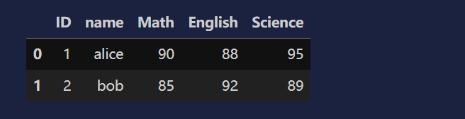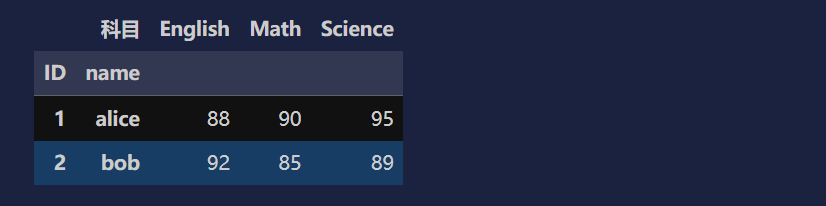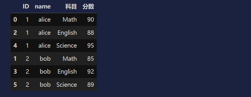 df2 = pd.melt(df, id_vars=['ID', 'name'], var_name='科目', value_name='分数')