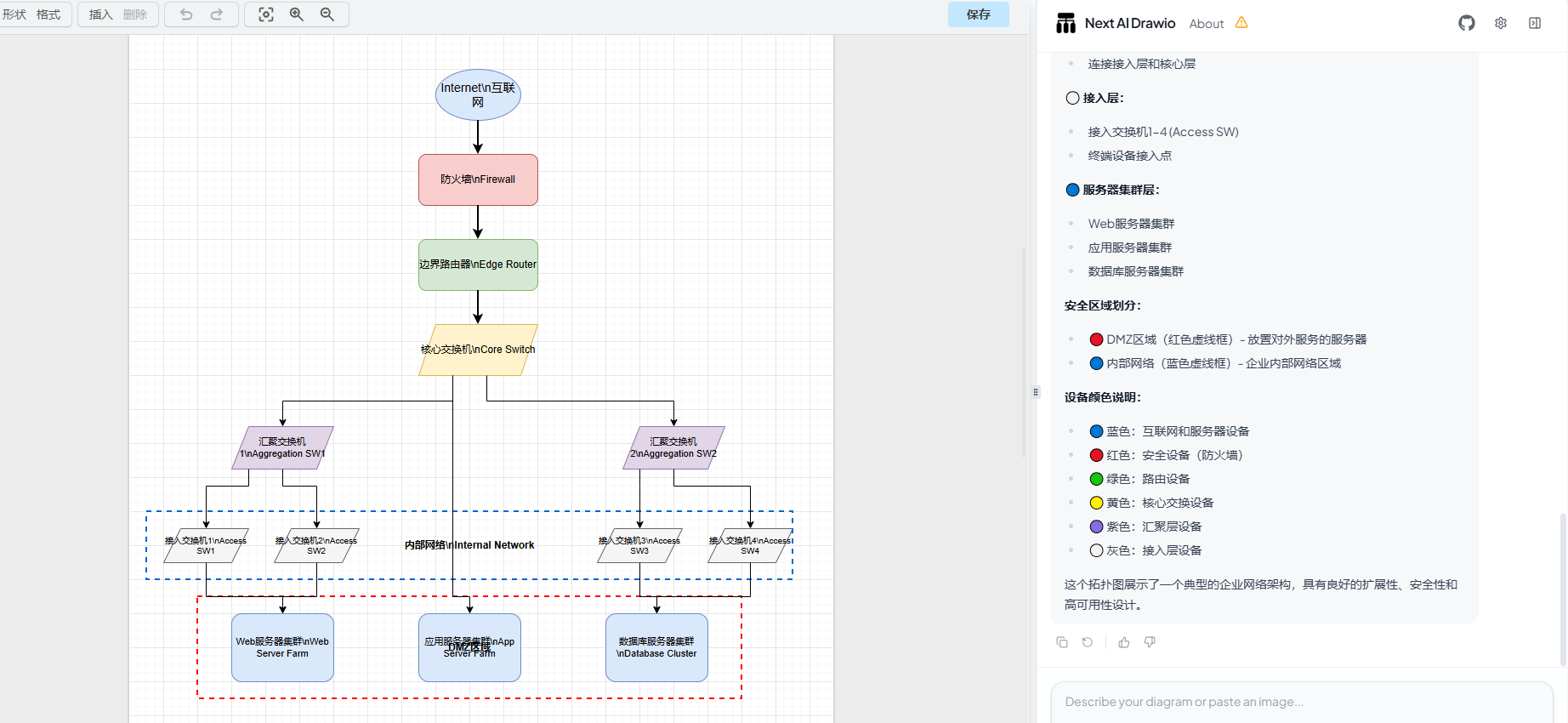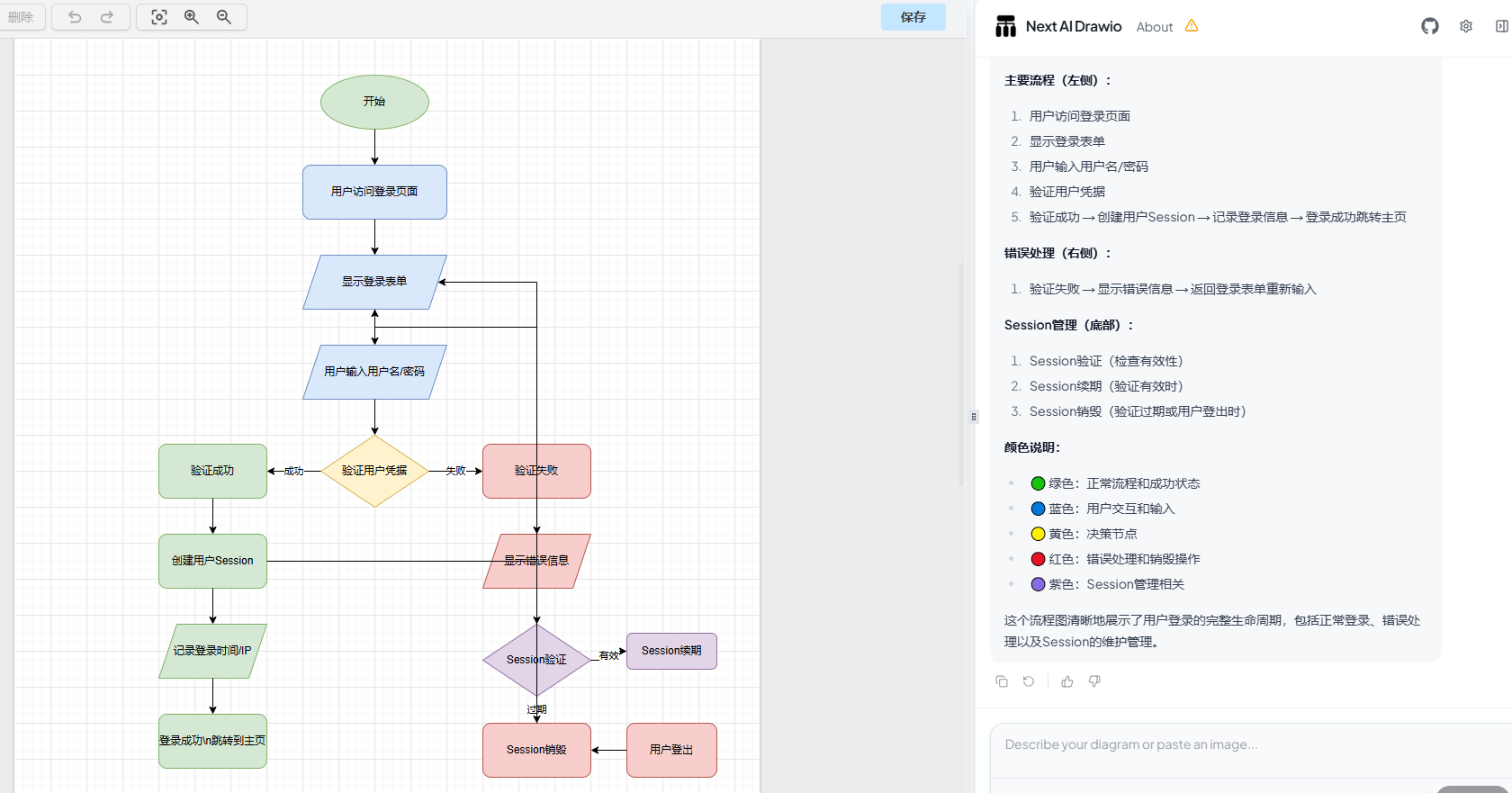 - 自然语言生成图表:用对话的方式描述你的需求,AI自动生成相应的draw.io图表