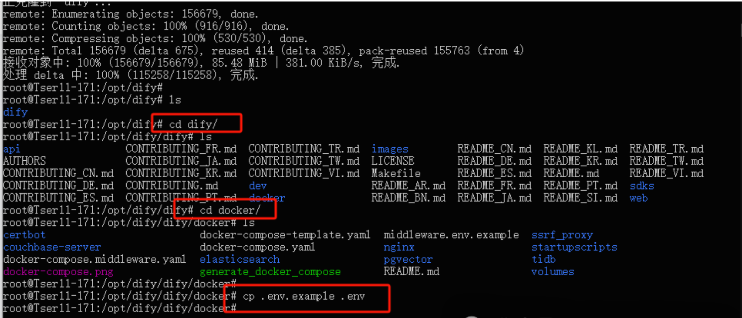进入到dify目录下的docker文件夹下,复制一份示例配置到 .env