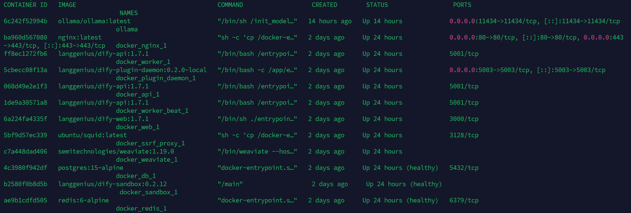 这些容器共同构成了Dify系统,每个容器都有其特定的功能和作用,确保系统的运行。