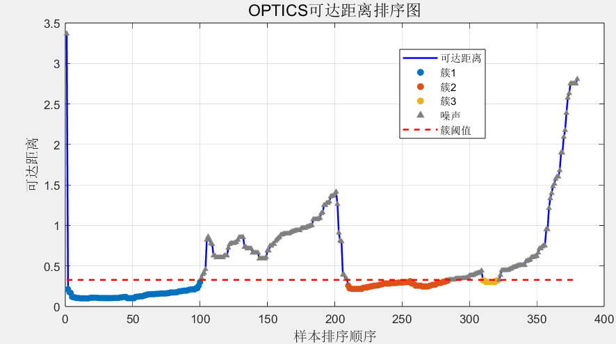 可达距离排序图的核心信息:图中出现三个连续的"低可达距离平台",对应三个密度簇------平台越平缓、距离越低,簇密度越均匀。两个"陡坡"(可达距离骤增)是簇的天然边界,这是OPTICS无需固定ε就能划分簇的关键:密度突变处就是簇边界。噪声样本因可达距离远超阈值,被单独标记,不会干扰正常簇的划分。