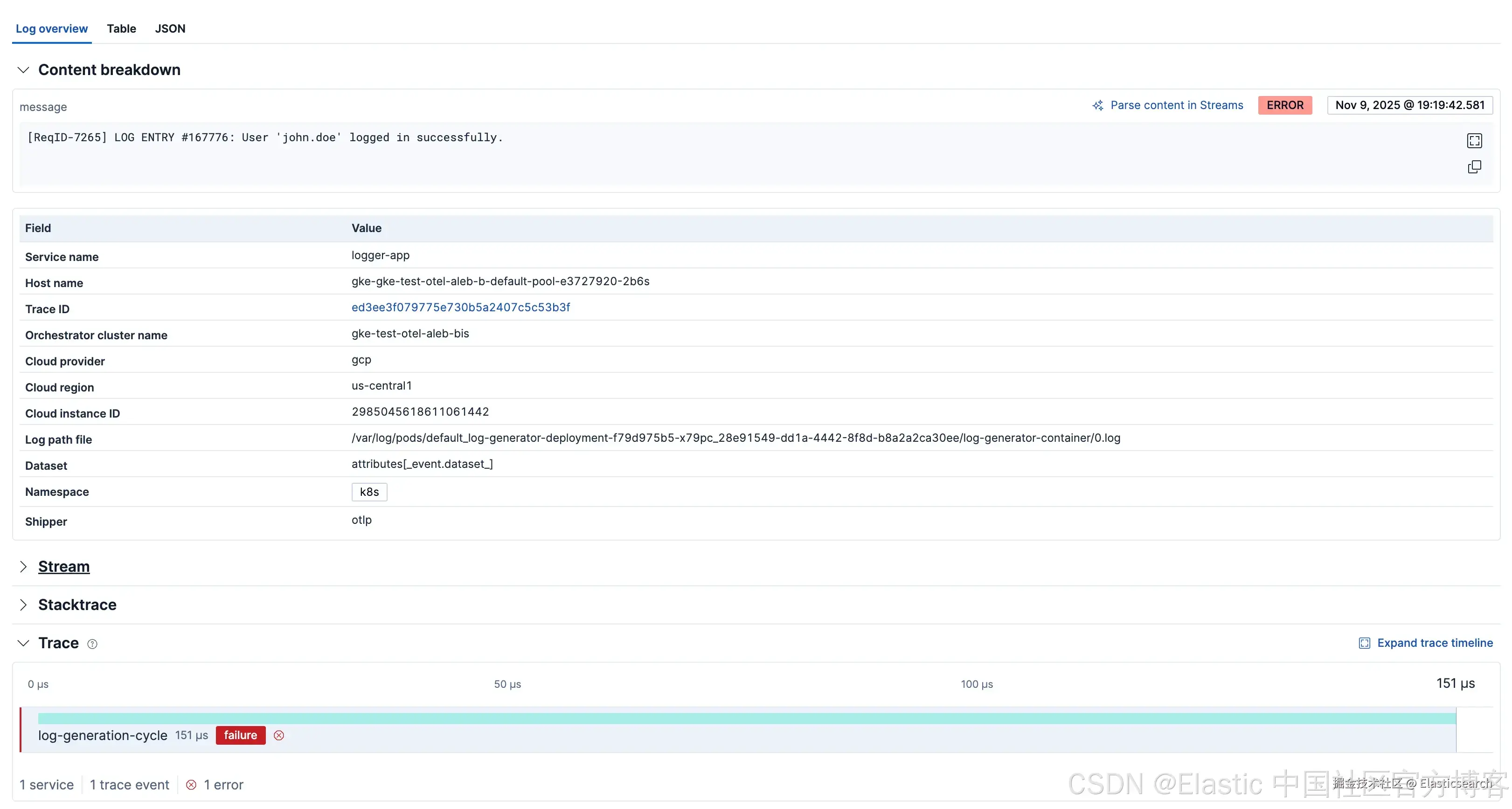 Elastic Observability 允许你通过使用 Elastic Distributions of OpenTelemetry,将 OTel traces 与 ECS 日志关联,从而拥有 OpenTelemetry 和 ECS 语义。