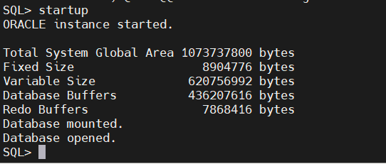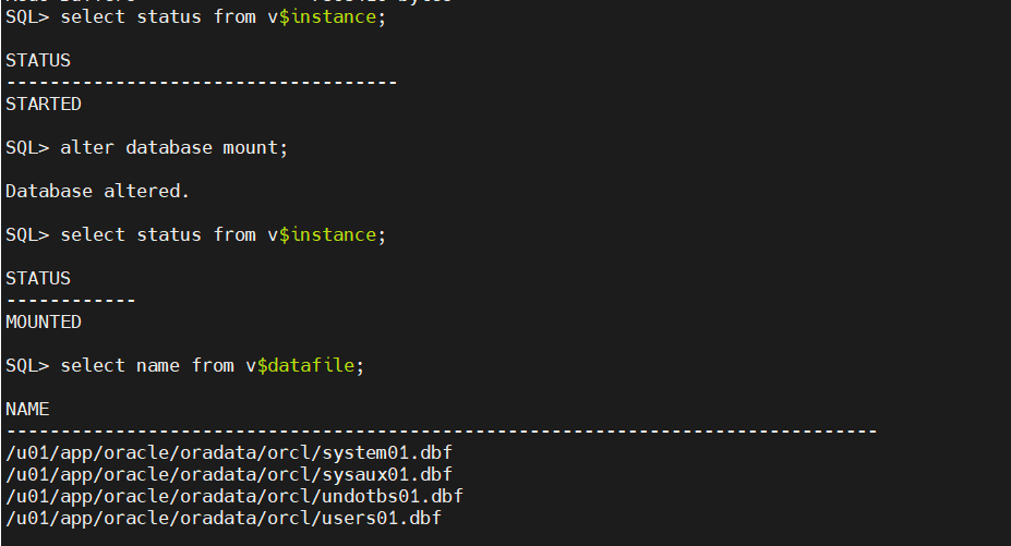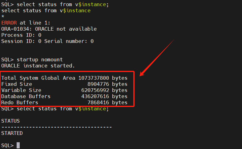 注:可以看出,在没进入nomount阶段的时候,此时查询实例的状态是没有对应的输出的,当进入nomount阶段之后,在独取对应参数文件,分配内存过后,就产生了相应的实例内容,此时进入了数据库启动的第一个状态:started。