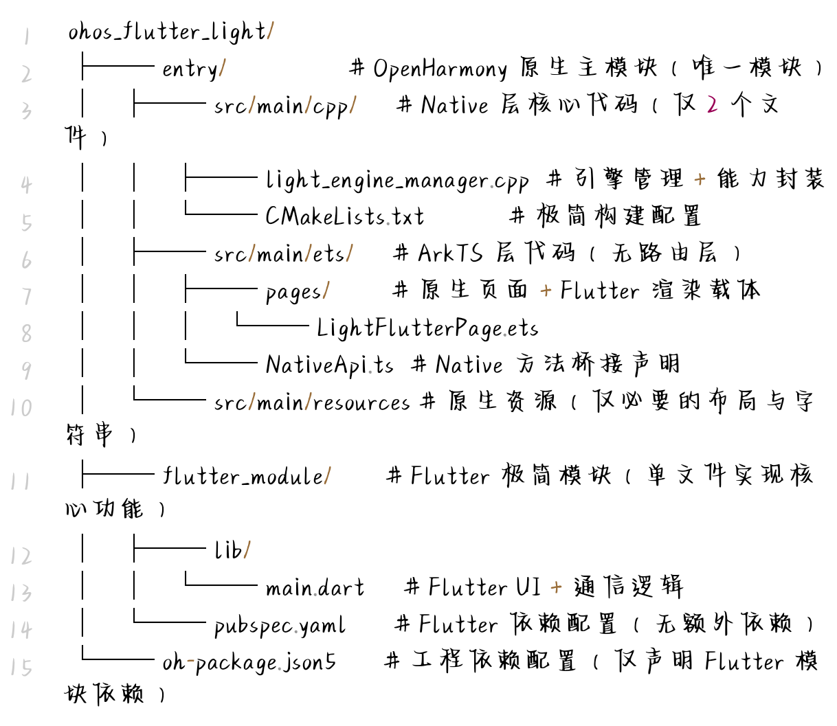 在全场景智能终端开发领域,OpenHarmony 凭借分布式内核、软总线通信及设备虚拟化技术,成为智能家居、穿戴设备、工业物联网等轻量级终端的核心操作系统;而 Flutter 以自绘渲染引擎、响应式 UI 框架及"一次编写,多端运行"的特性,成为解决跨设备界面一致性问题的高效工具。传统的混合栈集成方案往往引入复杂的路由管理与生命周期联动逻辑,导致工程体积膨胀、资源占用过高,难以适配内存受限的轻量级终端。本文提出一套轻量级能力增强方案,摒弃冗余架构设计,聚焦"Flutter 负责跨端 UI 呈现,OpenHarmony 提供原生分布式能力"的核心目标,通过极简代码实现二者的深度融合,兼顾开发效率与系统性能。