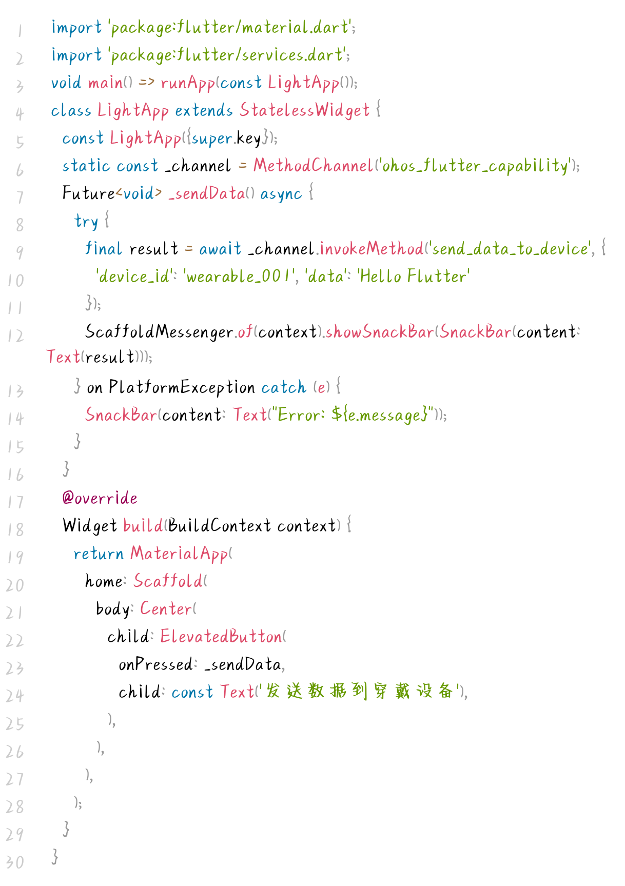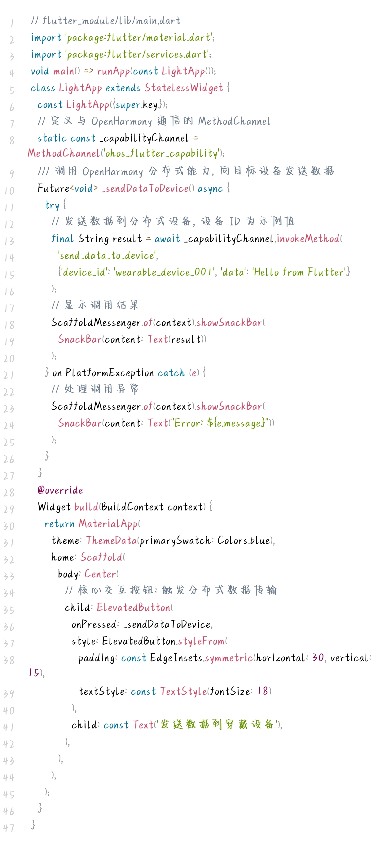 Flutter 侧仅需一个文件实现 UI 布局与分布式能力调用,无复杂依赖,代码极简且聚焦业务逻辑: