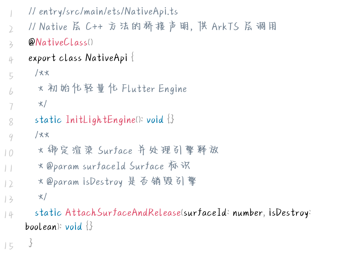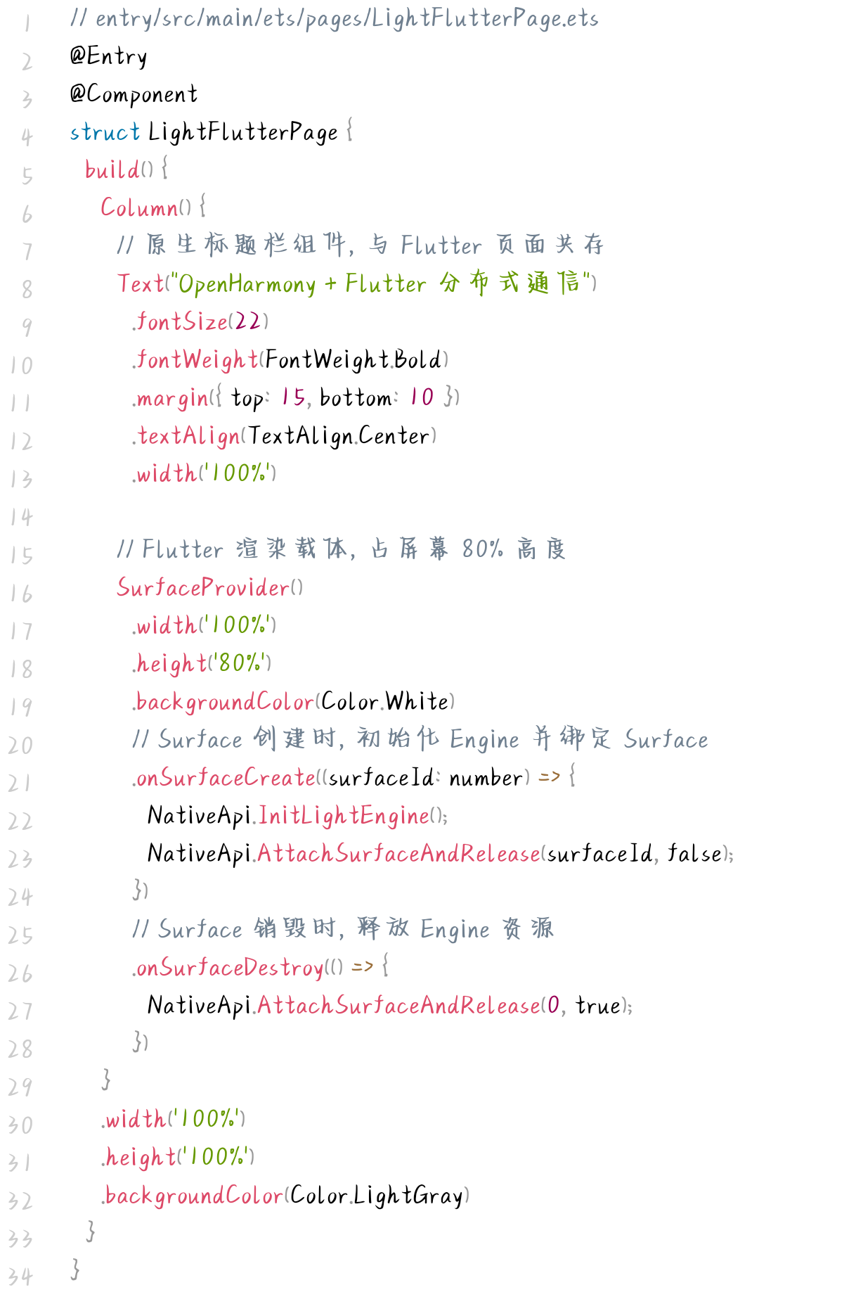 ArkTS 层仅需一个页面实现 Flutter 渲染载体,无路由逻辑,通过 SurfaceProvider 组件为 Flutter 提供渲染区域,并完成 Native 方法的桥接调用: