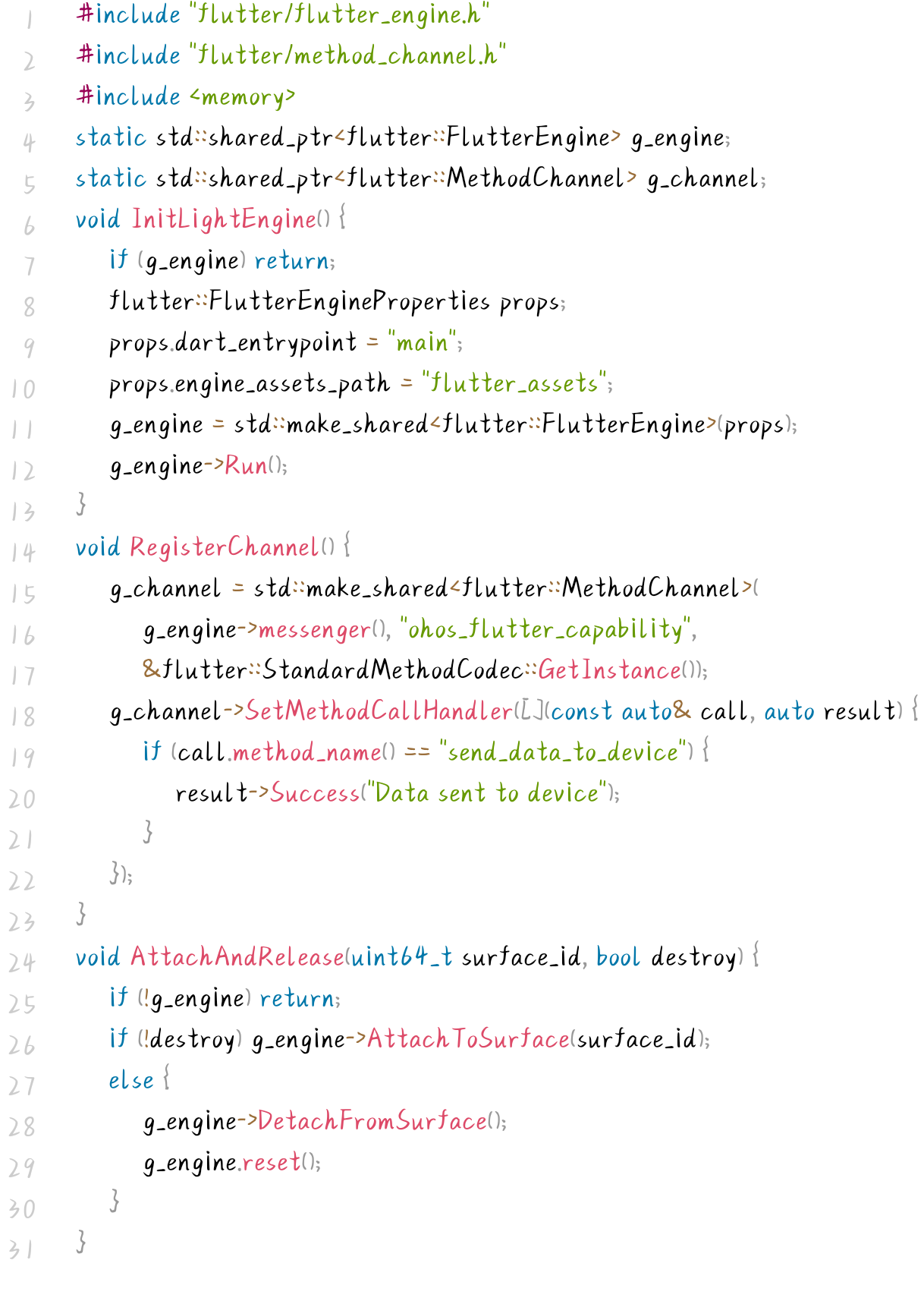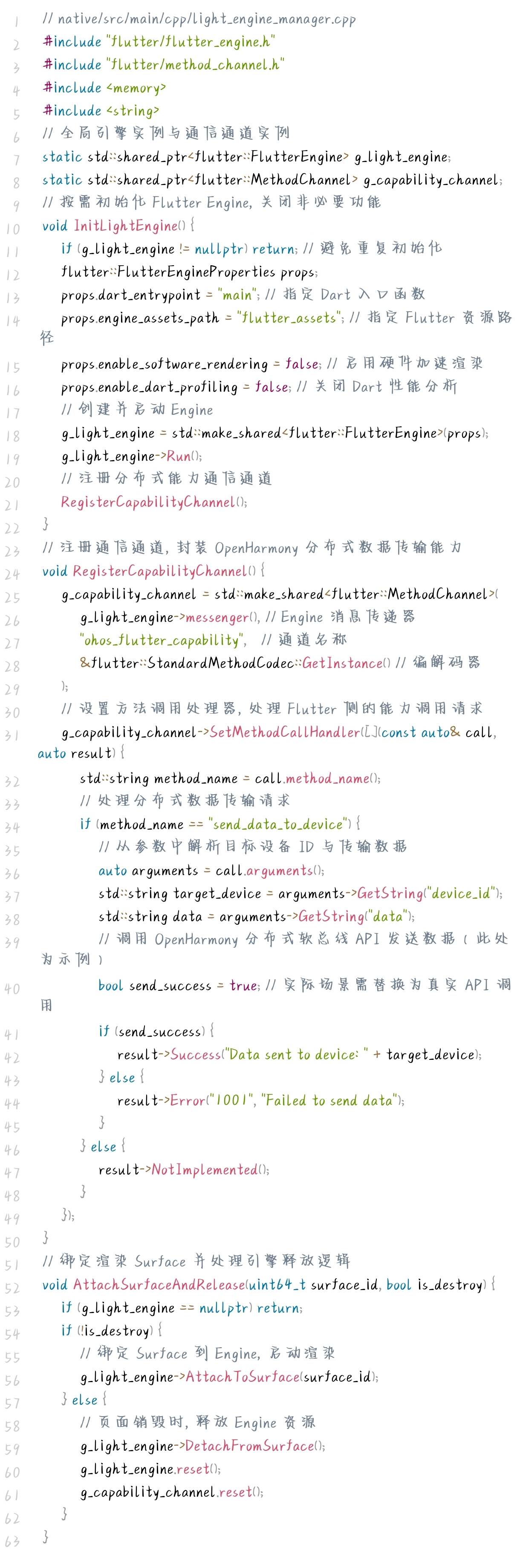 Native 层仅需一个文件实现 Flutter Engine 的初始化、释放、通信通道注册以及 OpenHarmony 分布式能力的封装,代码无冗余,聚焦核心逻辑:
