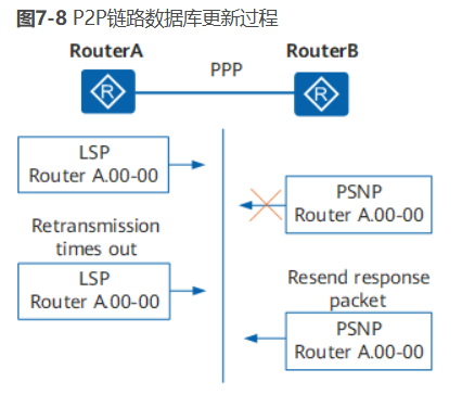 如图7-8所示假定RouterB向RouterA索取相应的LSP。RouterA发送RouterB请求的LSP的同时启动LSP重传定时器,并等待RouterB发送的PSNP作为收到LSP的确认。