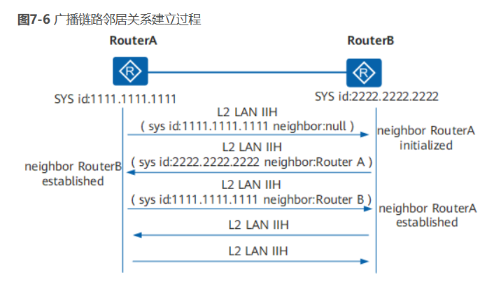 建立过程其实跟OSPF的邻居关系建立差不多,都是在确认收到对方知道自己为邻居的包后,邻居关系就建立。