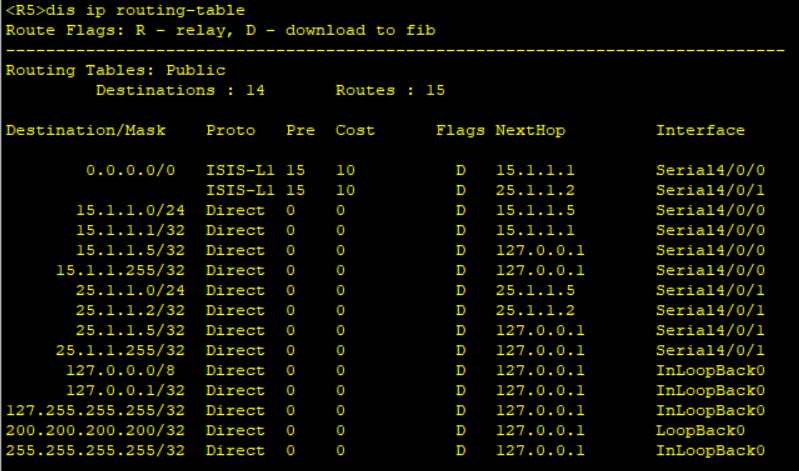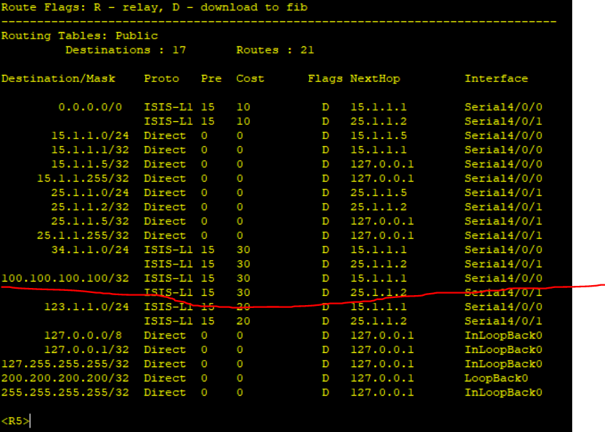 再查看R5路由表就会发现路由表中有了100.100.100.100/32的路由了。