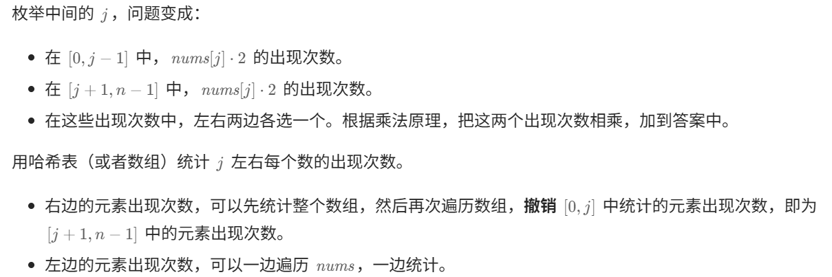 - 枚举 j,那么 i 和 k 自动被 j 隔开,互相独立,后续计算中无需关心 i 和 k 的位置关系。