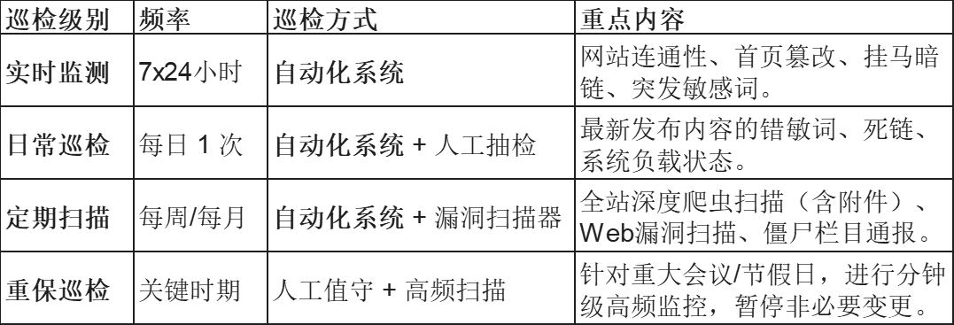 建立分级巡检制度,将自动化工具与人工复核相结合:
