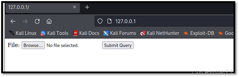 据此可知docker靶机http服务的80端口映射为宿主机的80端口,因此在kali中访问http://127.0.0.1:80 或者http://127.0.0.1 均可以打开靶机的web服务。