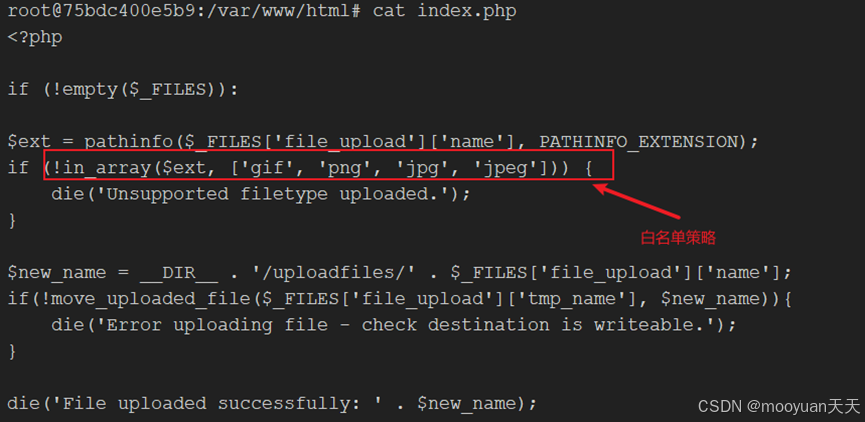 进入到Dokcer环境内部,查看网站源码,后端采用了白名单策略,只允许上传图片后缀格式,而且必须是gif, png, jpg, jpeg之一 ,如下所示。