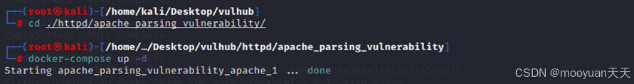 进入到apache多后缀解析目录里,使用docker-compose up -d命令启动环境。Vulhub 的脚本会自动从 Docker Hub 拉取预先构建好的镜像并启动容器。