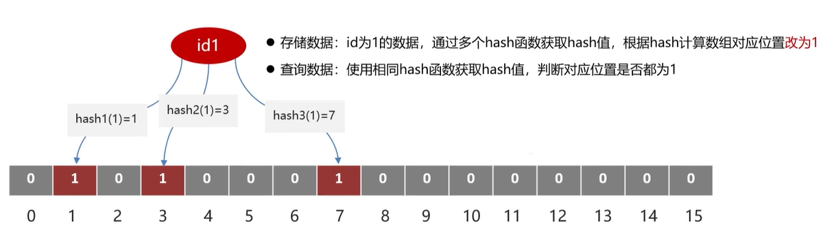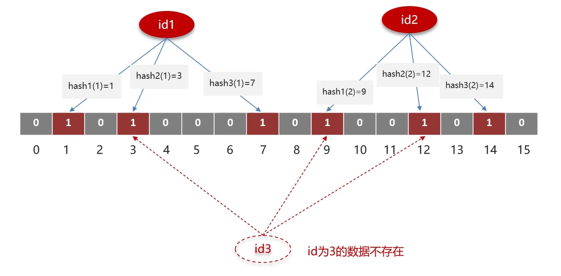 比如:id = 3 的数据是不存在的,但是经过三次 hash 计算后,Redis 发现计算的数组位置都为 1,则误判 id = 3 数据存在。