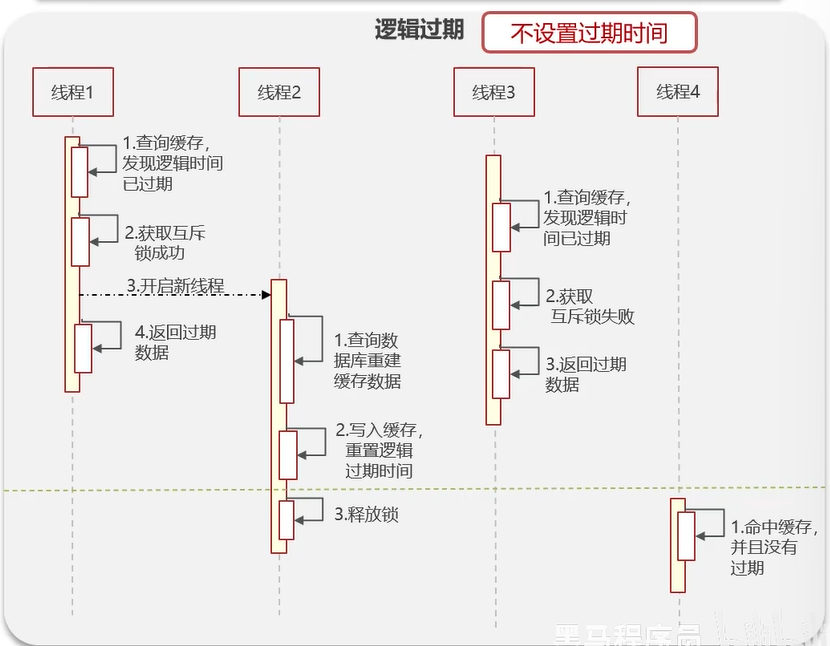 - 在线程 2 进行缓存重建的过程中(没释放锁之前):其他线程(比如线程 3)来到 Redis 查询数据,发现逻辑时间过期,获取互斥锁失败,会返回一个过期数据回去。
