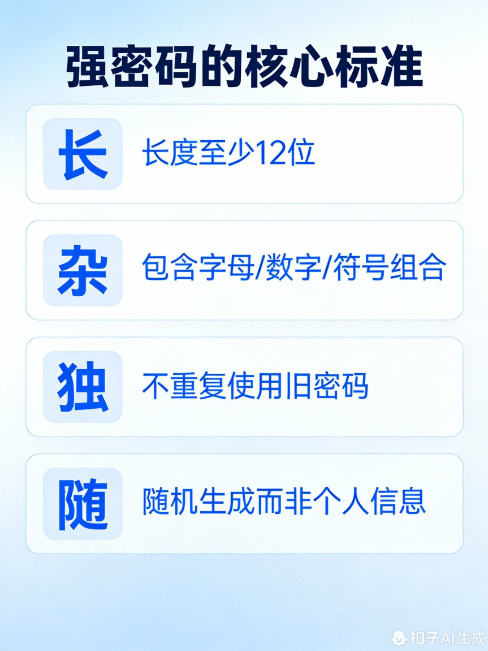 - 为每个网站/应用设置不同密码(如邮箱、银行、社交账号密码完全独立);