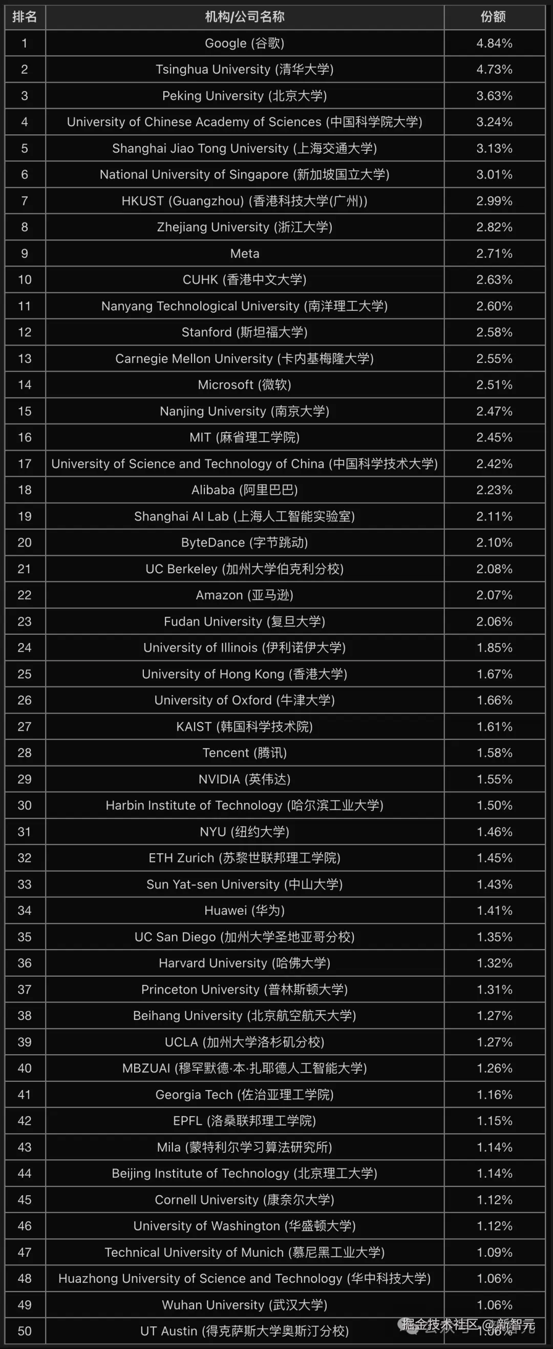 - 清华大学以 4.73% 的份额紧随其后,两者差距缩小至仅 0.11%。