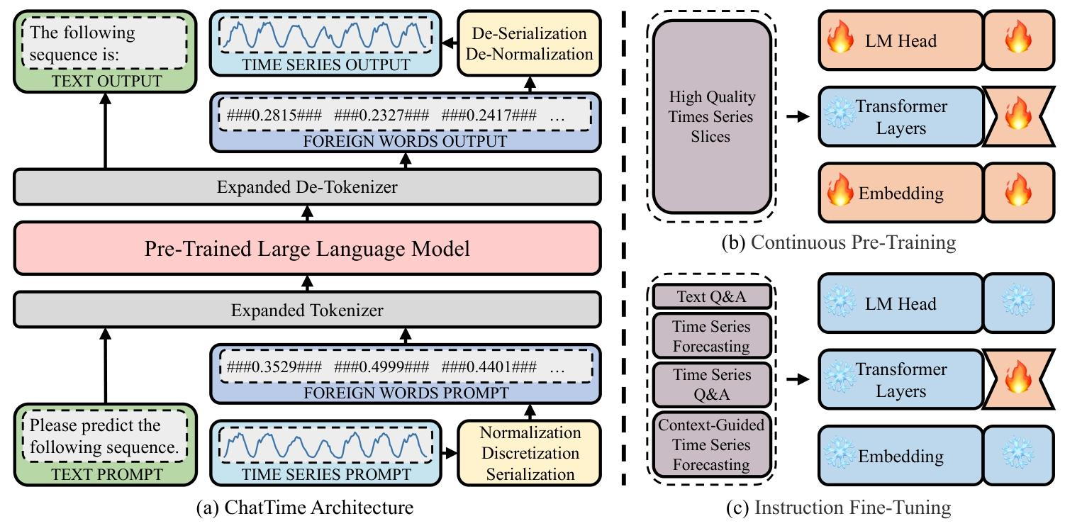 将时间序列视为"外语",通过词汇扩展使预训练LLM能处理时间序列,无需从头训练或修改模型架构,实现时间序列与文本的统一处理。