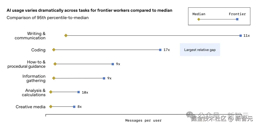 不同任务的差距各异:在**「编程」任务上,头部与中位数的差距最大,达 「17 倍」;在 「分析与计算」**任务上,差距为 「10 倍」。