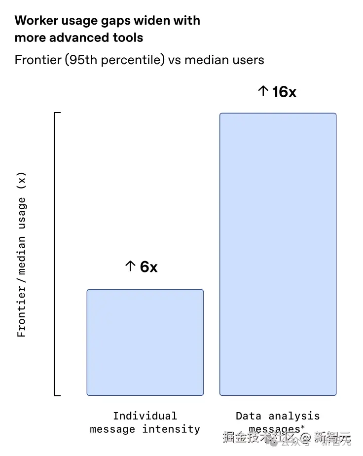数据揭示了惊人的使用差距:前 5% 的头部员工(Frontier workers)发送的消息总量是中位数员工的 「6 倍」。