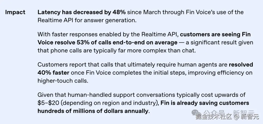 使用 Realtime API 后,Intercom 的语音延迟降低了 「48%」 ,AI 能够端到端解决 「53%」 的电话咨询,人工处理后的通话时长缩短了 「40%」。
