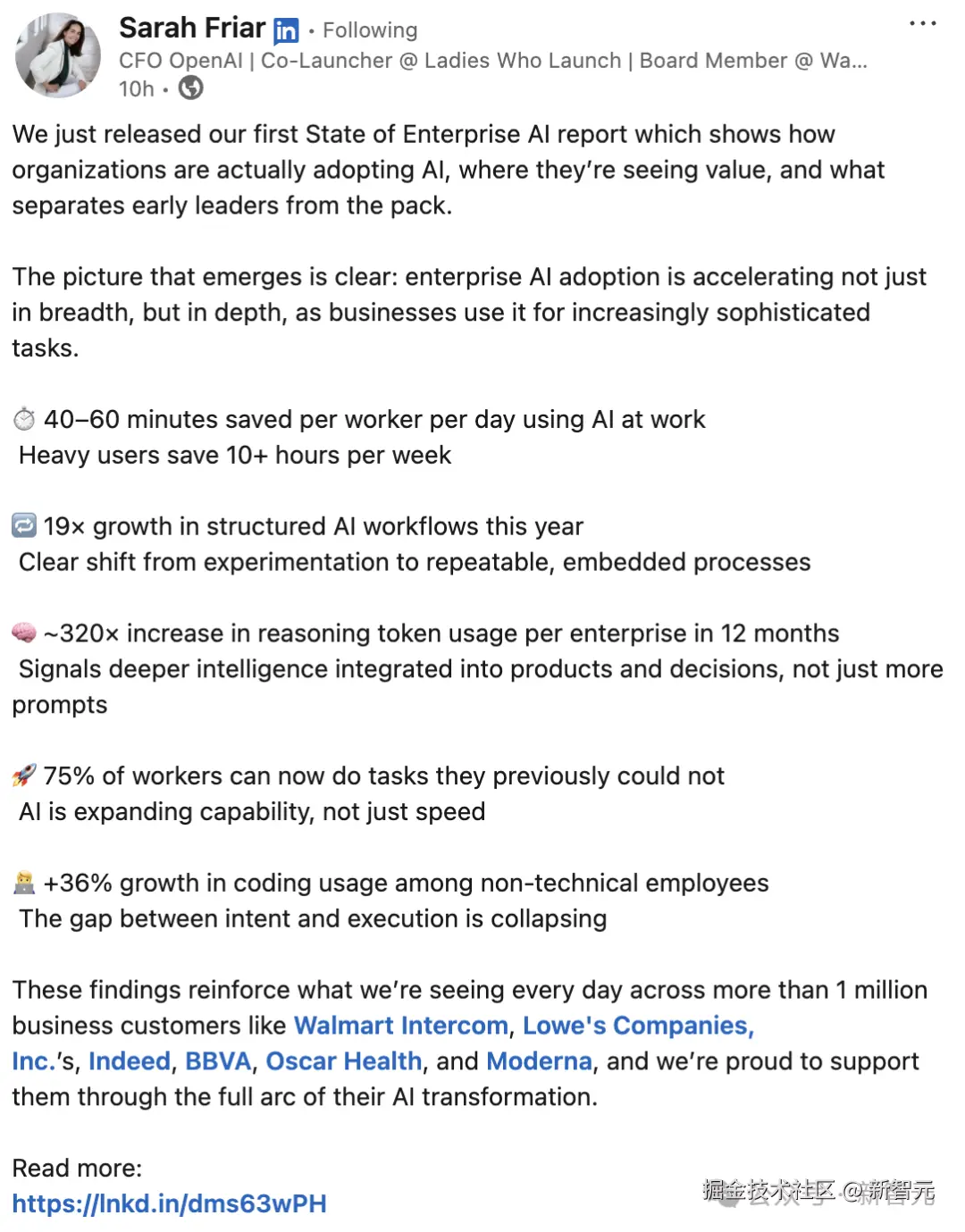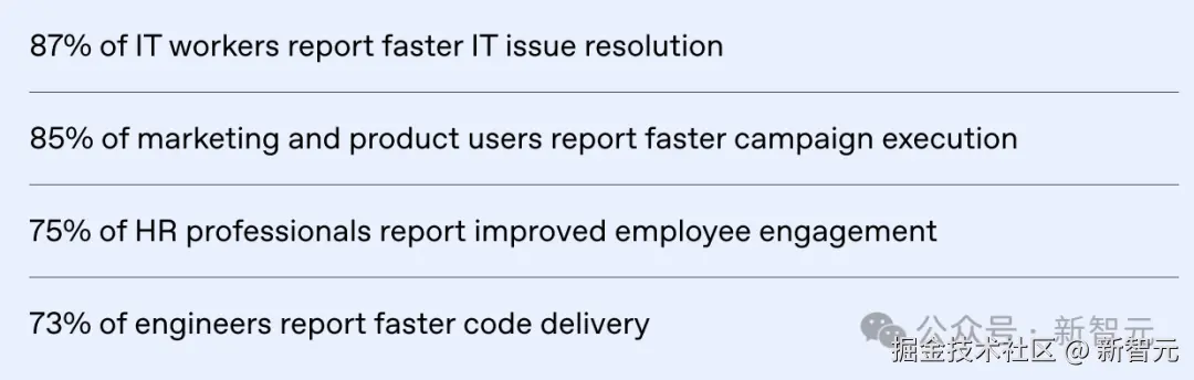 ⏱️**效率飞跃:**员工利用 AI 工作每天平均节省 「40--60 分钟」 ;重度用户每周节省时间超过 「10 小时」。