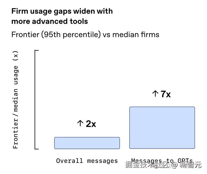 在企业层面,头部企业(Frontier firms)每席位的消息量是中位数企业的 **2 倍,**且发送给 Custom GPTs(代表标准化工作流)的消息量是中位数企业的 「7 倍」。