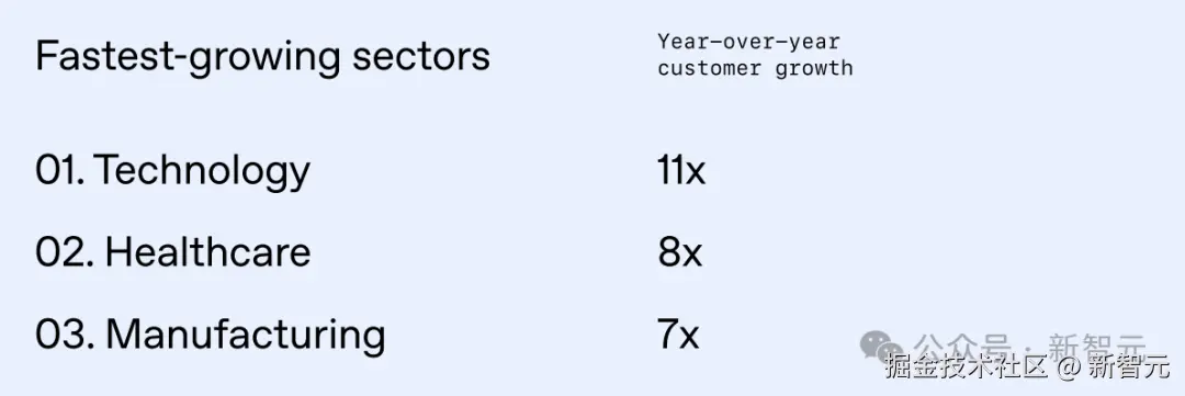 具体增长数据为:科技行业增长 「11 倍」 ,医疗保健增长 「8 倍」 ,制造业增长 「7 倍」。