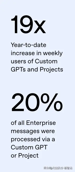 自 2024 年 11 月以来,企业周消息量增长约 「8 倍」 。定制化工具使用率飙升,CustomGPTs 和 Projects 的周用户数增长了 「19 倍」 ,目前约 「20%」 的企业消息是通过这些定制工具处理的,显示工作流正被数据化和标准化。