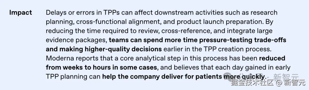 Moderna 利用 AI 处理庞大的证据包(有时长达 「300 页」的数据),将目标产品概况(TPP)的起草和分析流程从数周压缩至「数小时」。