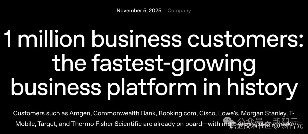 「11 月 5 日, 「OpenAI 宣布,全球已有超过 **「100 万家企业客户」**正在直接使用其 AI 服务,成为」史上增长最快的商业平台」。