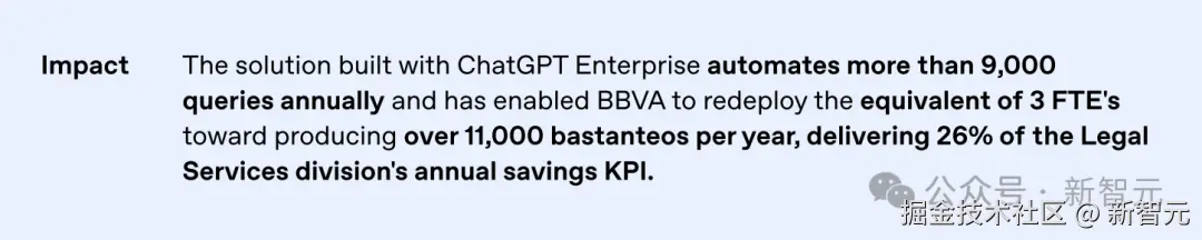 BBVA 的法律 AI 聊天机器人每年自动处理超过 「9,000」 个查询,帮助完成了超过 「11,000」 个法律验证,贡献了法律服务部门年度储蓄 KPI 的 「26%」。