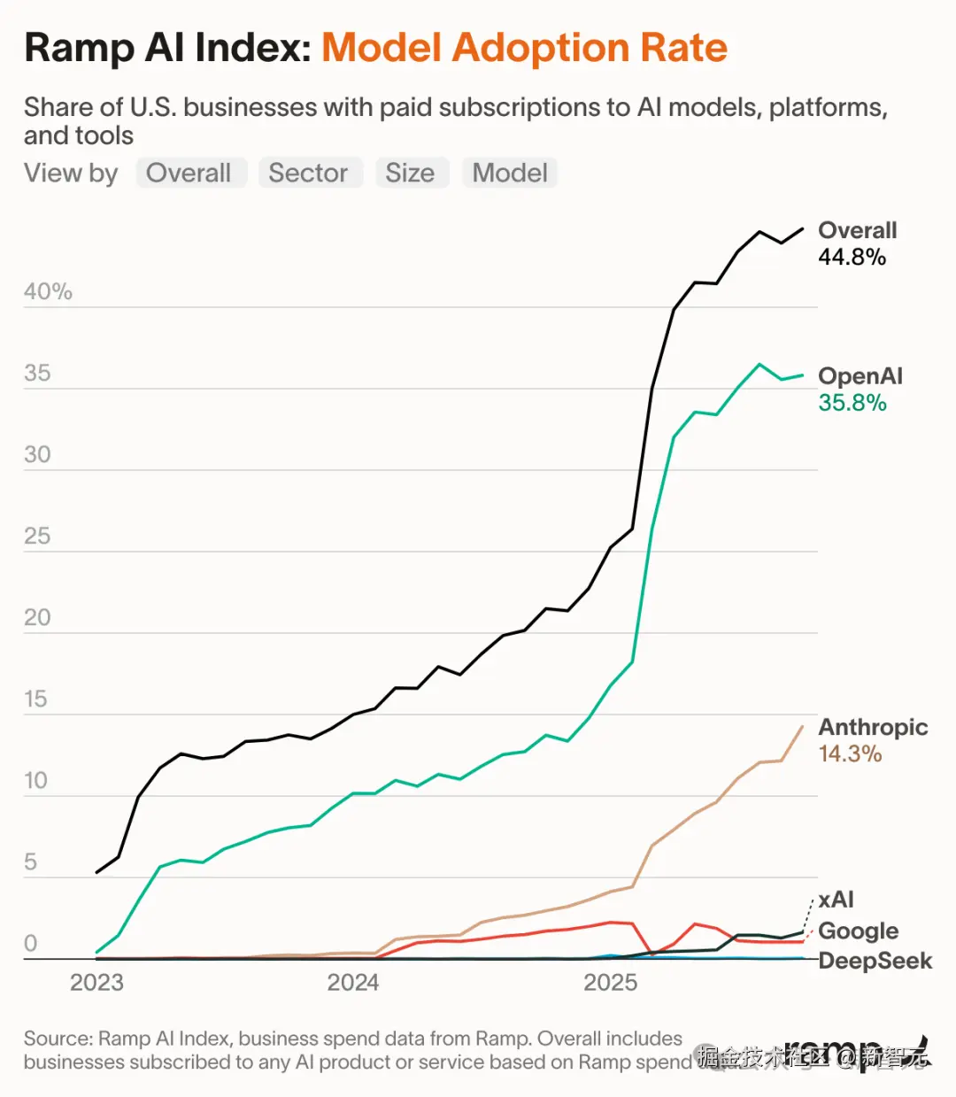 Ramp AIIndex 统计:「美国接近 36% 的企业已成为 ChatGPT Enterprise 客户」,Anthropic 的占比为 14.3%。