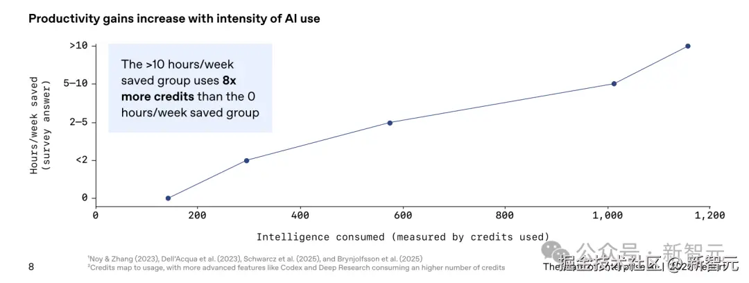 数据表明使用深度与产出成正比:节省超过 **「10 小时 / 周」**的员工,其消耗的 Intelligence Credits(衡量模型使用量的指标)是未节省时间员工的 「8 倍」。