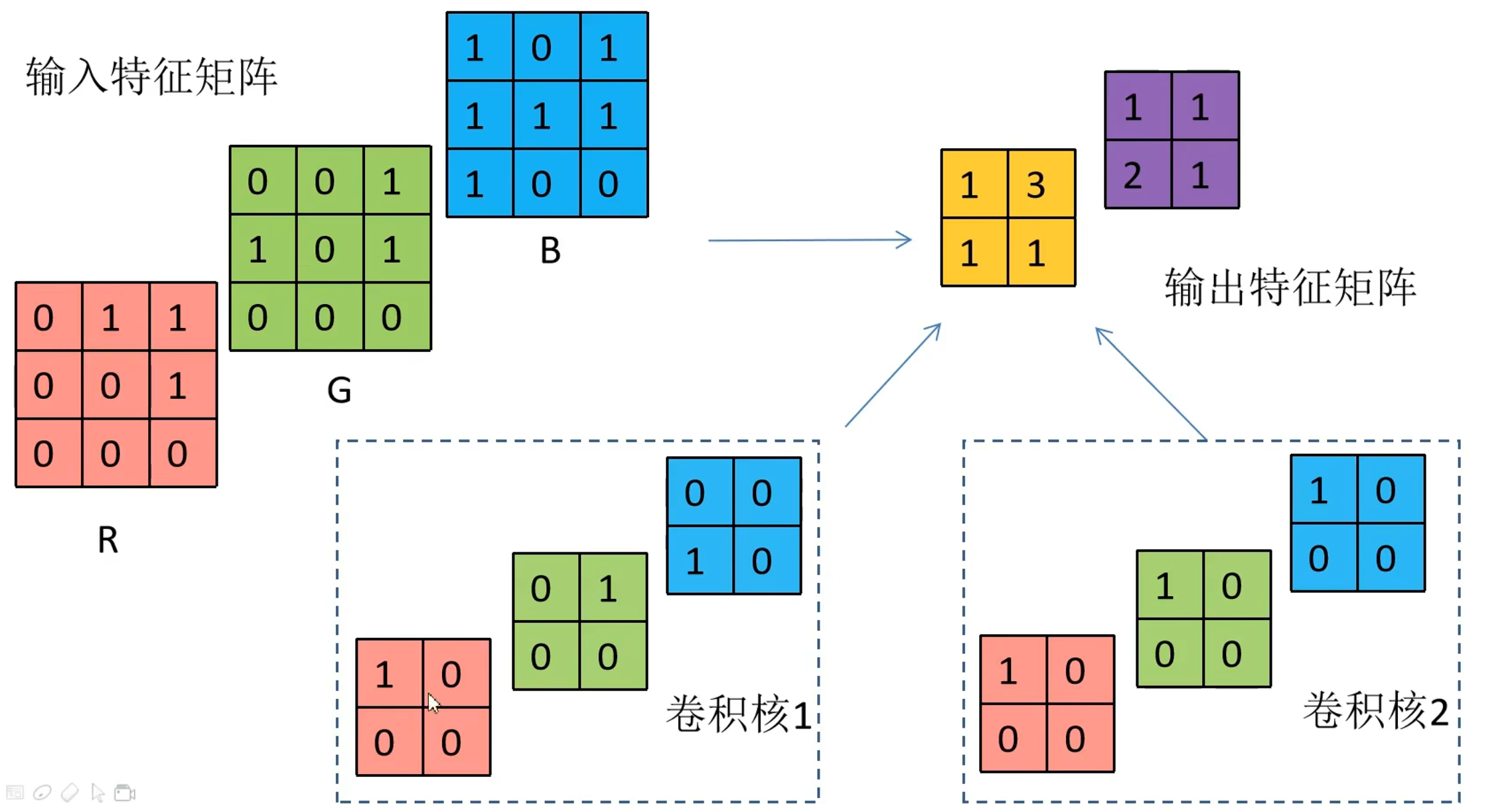 多维(通道)特征向量做卷积操作,深度(通道channel)保持一致,如正常特征图RGB三个维度,那么卷积核理应保持三个维度。将每个维度的卷积核放到对应的维度上做卷积操作,最后求和。