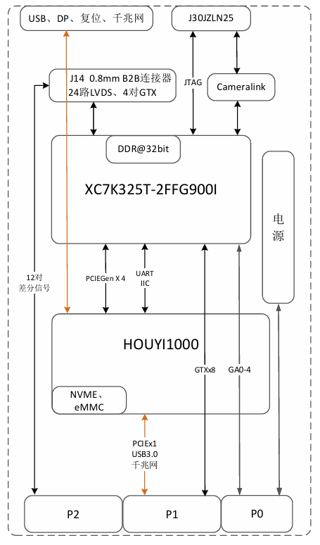 支持多路 H.264/H.265 硬件编解码:解码:2*4K 60fps。编码:2*8K 30fps。 4) 一片Kintex-7系列的325T FPGA,灵活实现自定义接口扩展,包含不限于 SRIO、万兆网、Aurora等。