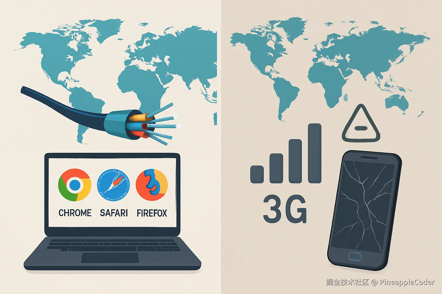 | 设备性能 | 高配笔电、旗舰手机 | 低端手机、老旧平板 | JS 执行速度、渲染速度 |
