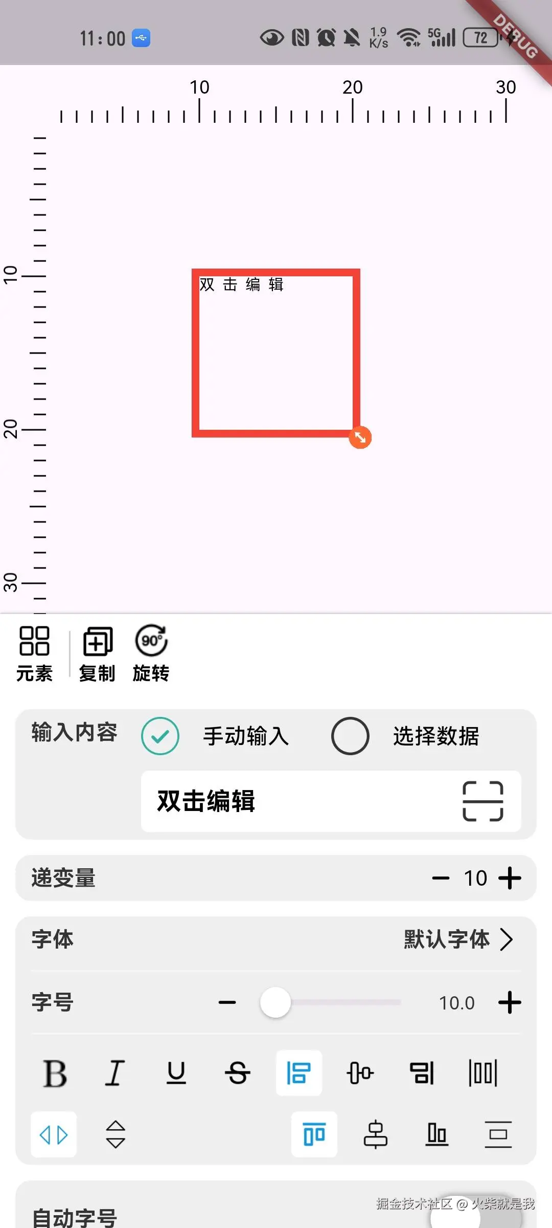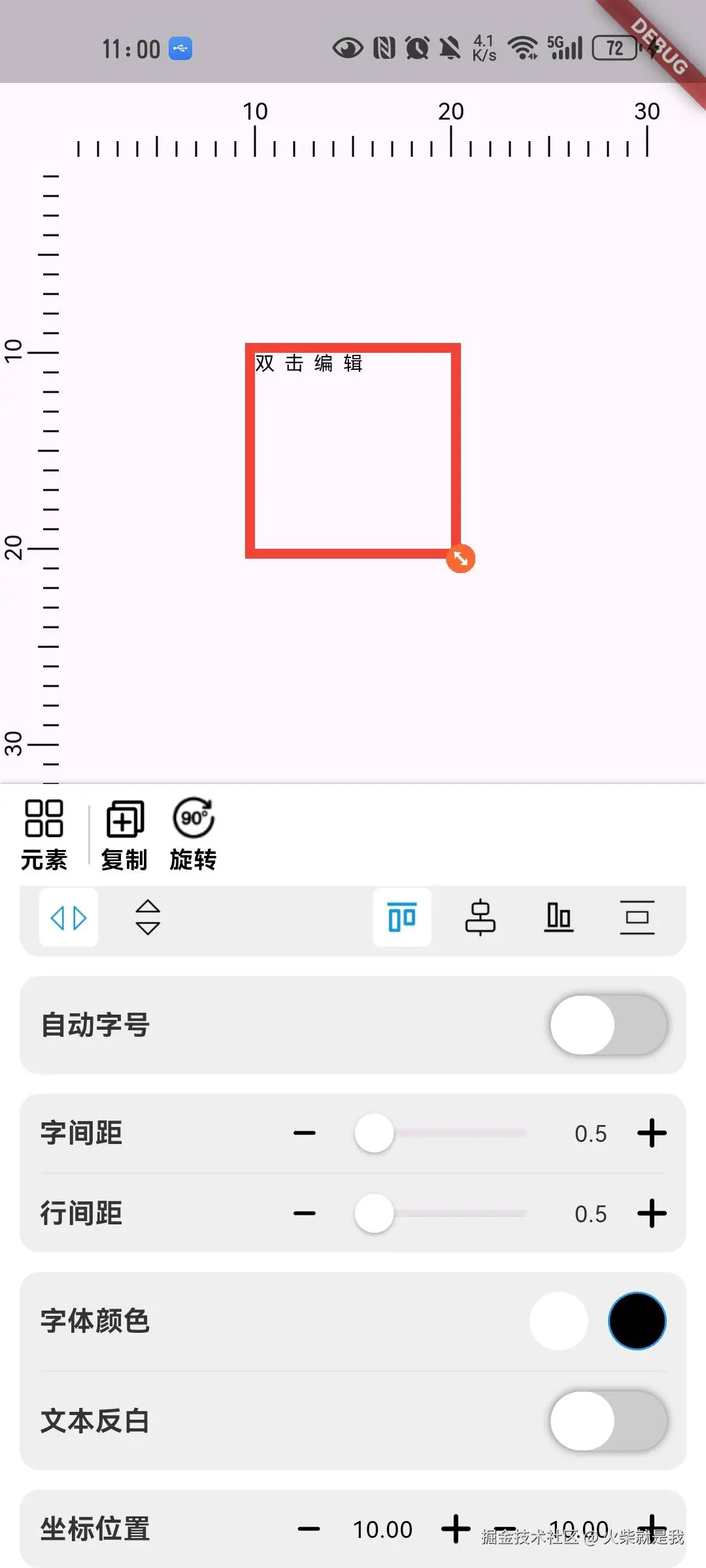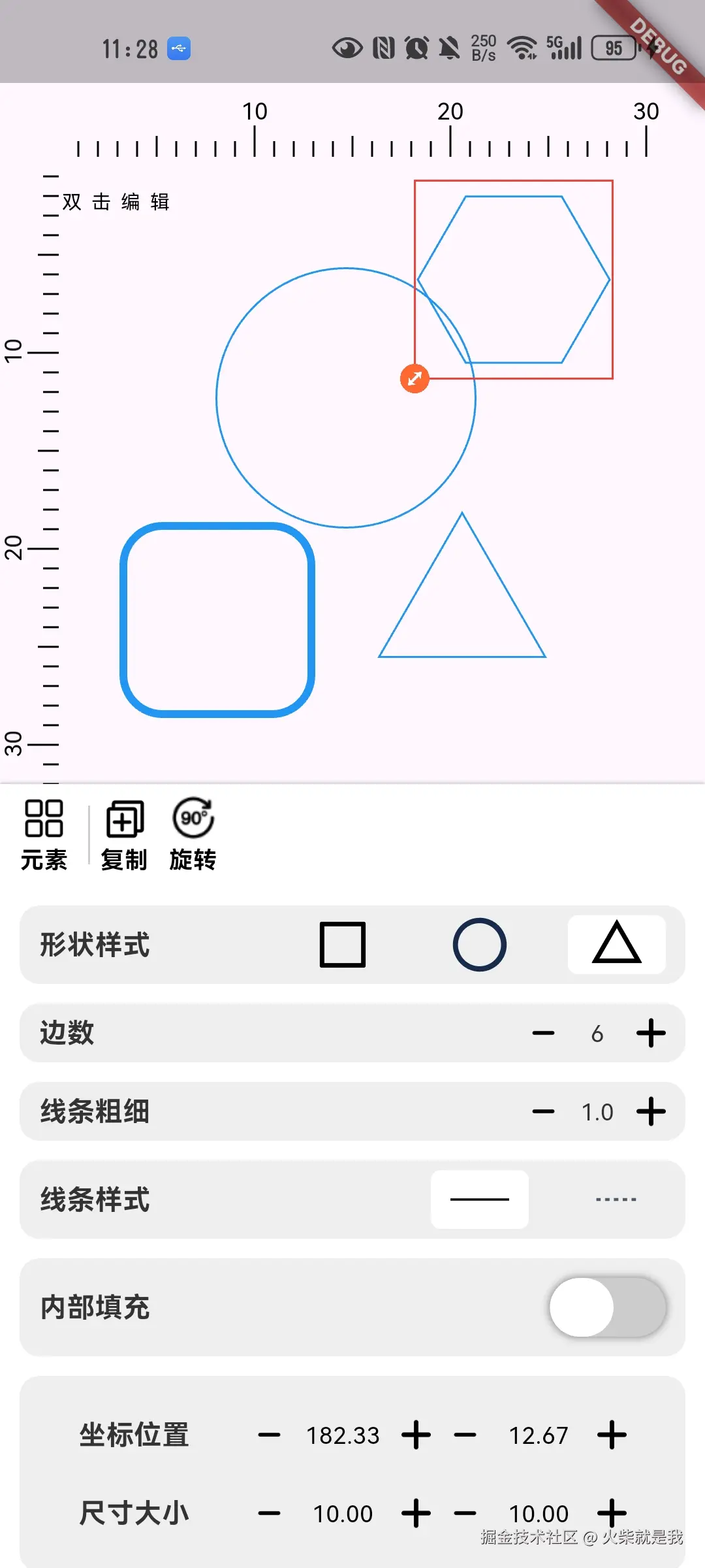 添加矩形图元(支持设置圆角 设置是否填充 支持设置边框宽度)添加圆形图元(支持设置是否填充 支持设置边框宽度)图元支持选中 平移 拉伸 任意角度旋转 旋转不影响手势响应 旋转之后平移拉伸交互合理添加文本 暂时支持普通绘制增加刻度修改图元的宽高坐标都以刻度尺数值为准修复圆形旋转120度 拉伸异常问题文本支持水平 垂直 居左中右 均分文本支持字号 字间距 行间距 调整文本支持粗体 斜体 下划线 中划线 设置文本支持自动字号 文本颜色调整实现图形的添加 圆形 三角形 多边形支持设置虚线 调整线条宽度 设置是否填充